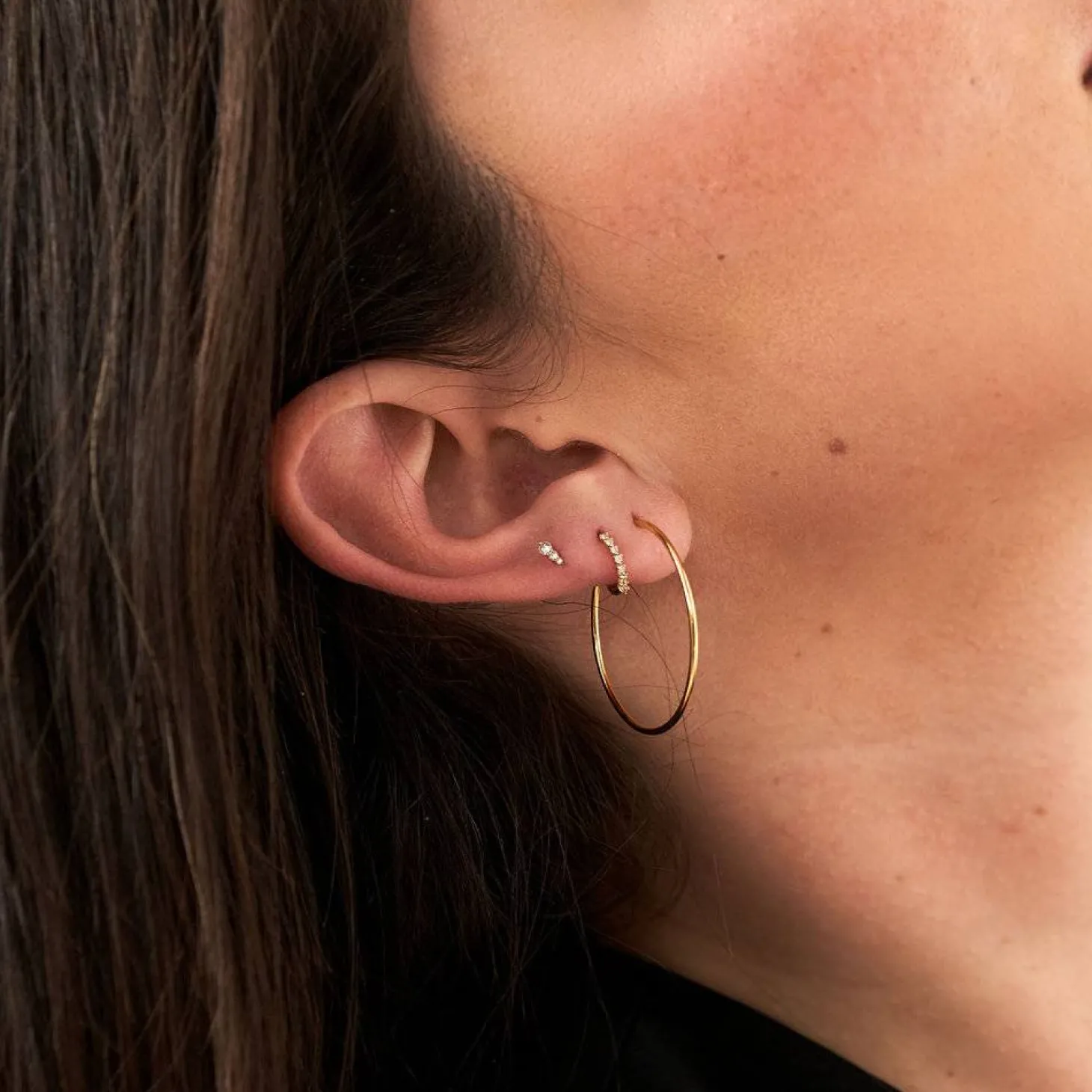 How To Wear It: To bring your outfit together, style your hoop earrings with other gold jewelry from our collection for a cohesive look. You can also create a stack with our hoop earrings, such smaller hoops or studs, for that chic statement vibe.