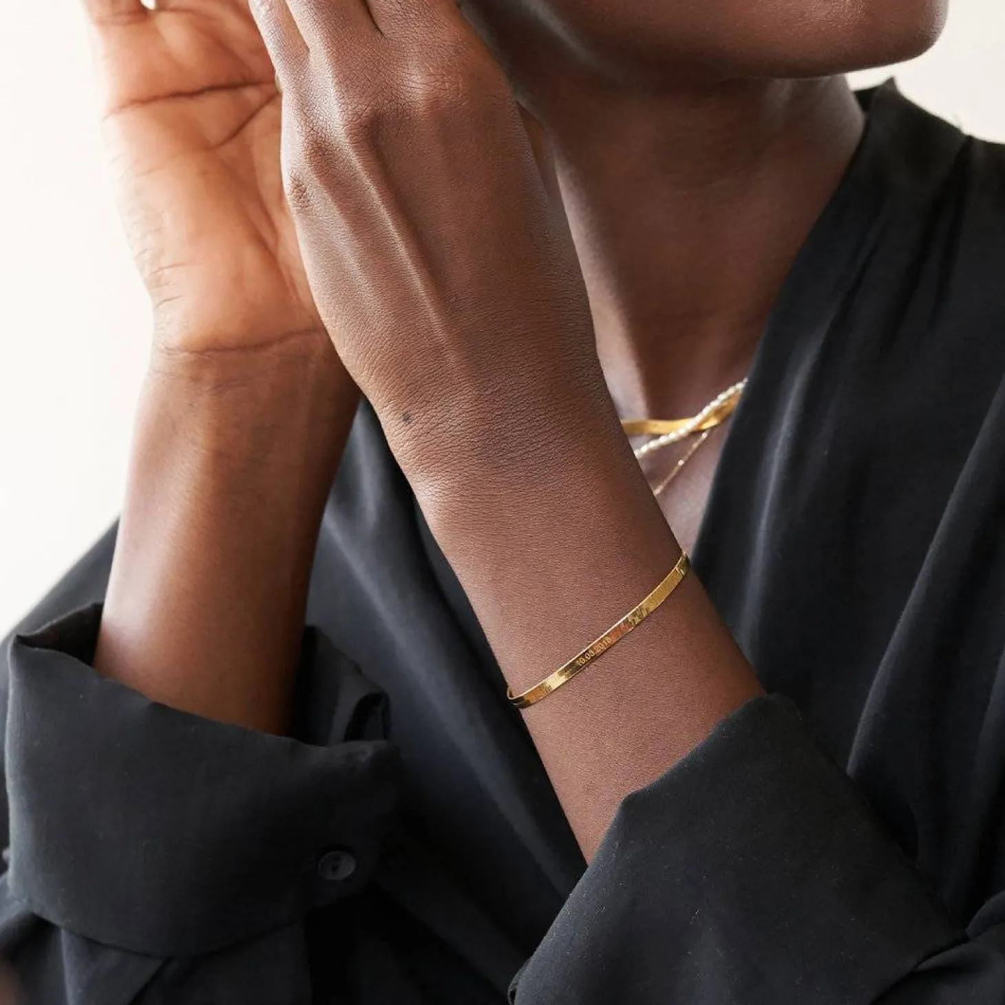 The Herringbone Engraved Slim Bracelet in Gold Plating is a sophisticated bracelet with a unique, personalized touch. This chic and delicate wrist piece features an engraved phrase on a slim herringbone gold-plated snake band. Just imagine how great you’ll feel sliding this gorgeous little treasure on your wrist for everyday wear or as a special occasion accessory.