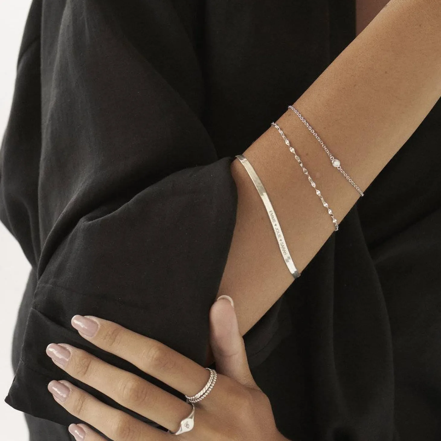 Whether you’re looking for a sentimental and meaningful gift or want to make your day-to-day more stylish, the Herringbone Engraved Slim Bracelet in Sterling Silver is perfect – it has both options covered. This personalized bracelet comes in sterling silver and features an incredibly thoughtful herringbone design. The slim silver herringbone bracelet makes this a piece that can be worn all year round because its elegant simplicity works with any outfit, during any season – making it very versatile too!
