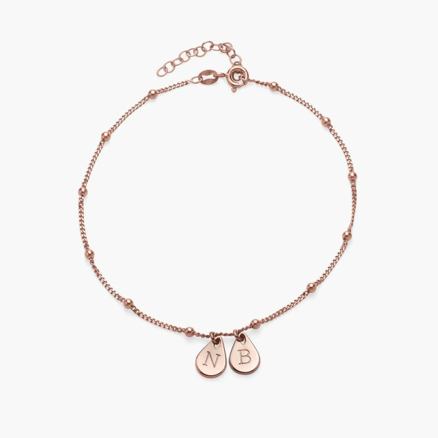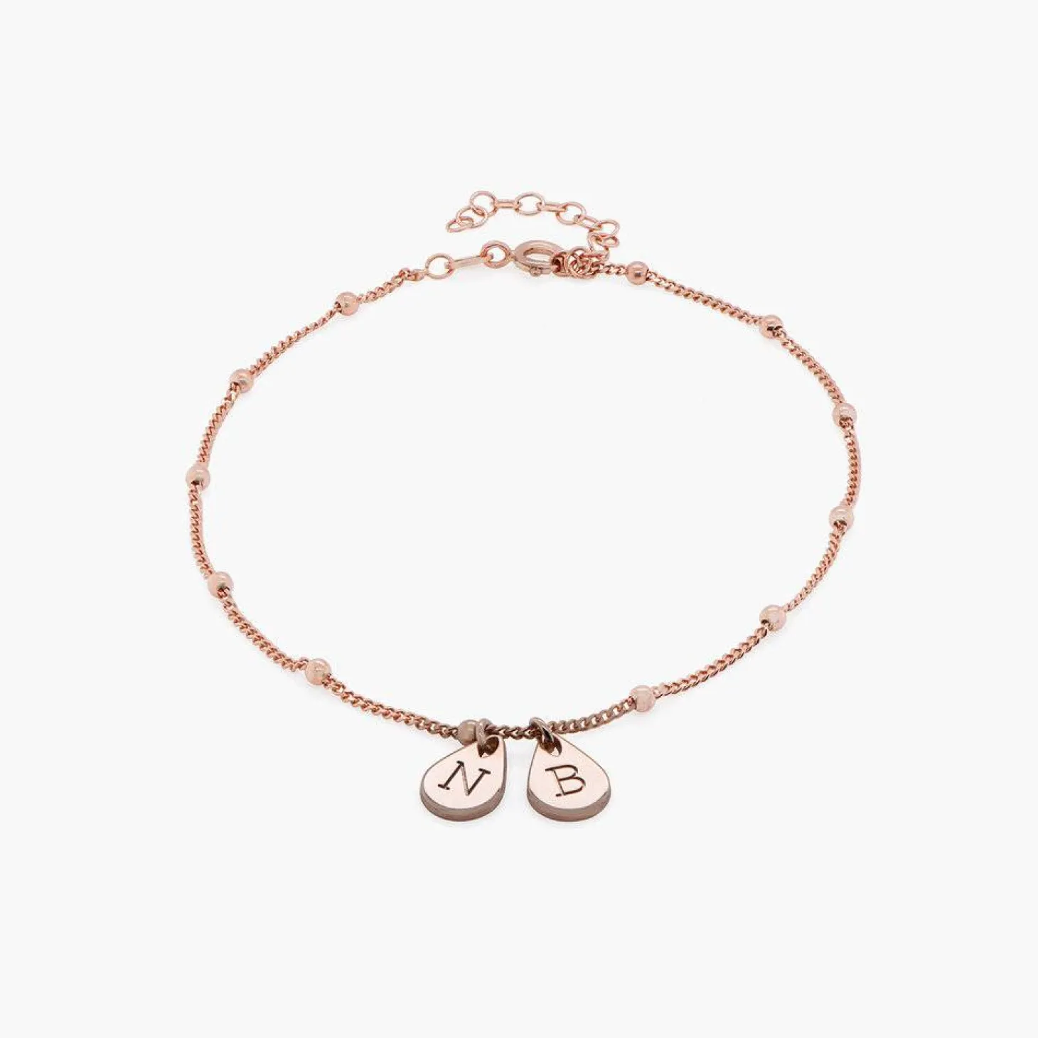 Just as a drop creates a ripple effect, the Maren Ankle Bracelet with Initials in Rose Gold Plating creates a ripple of beauty and love. With up to three places to add personalization, you can easily look down at your ankle and feel all that make you, you.