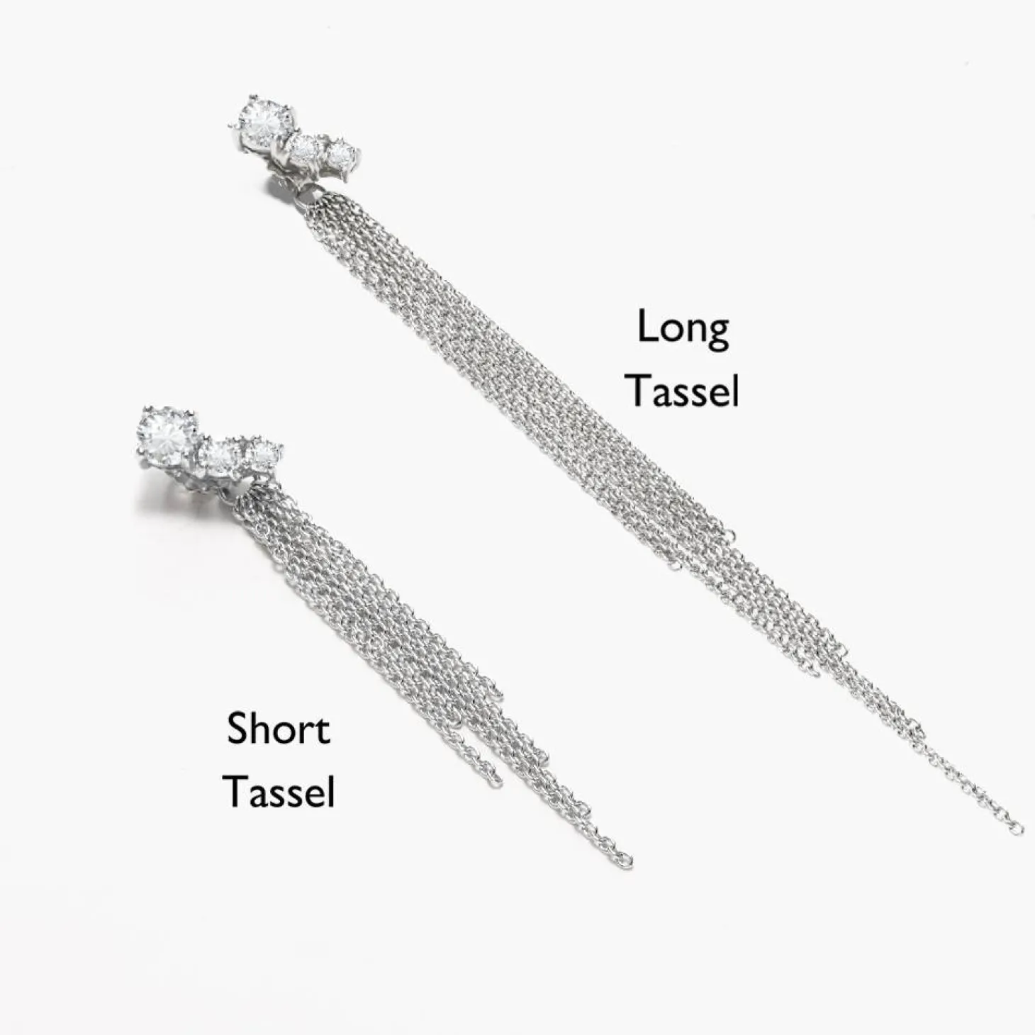 Unveil a world of lavish indulgence with our Mimosa Long Tassel Stud, graced by a trio of mesmerizing 0.45 CT Diamonds in Sterling Silver.