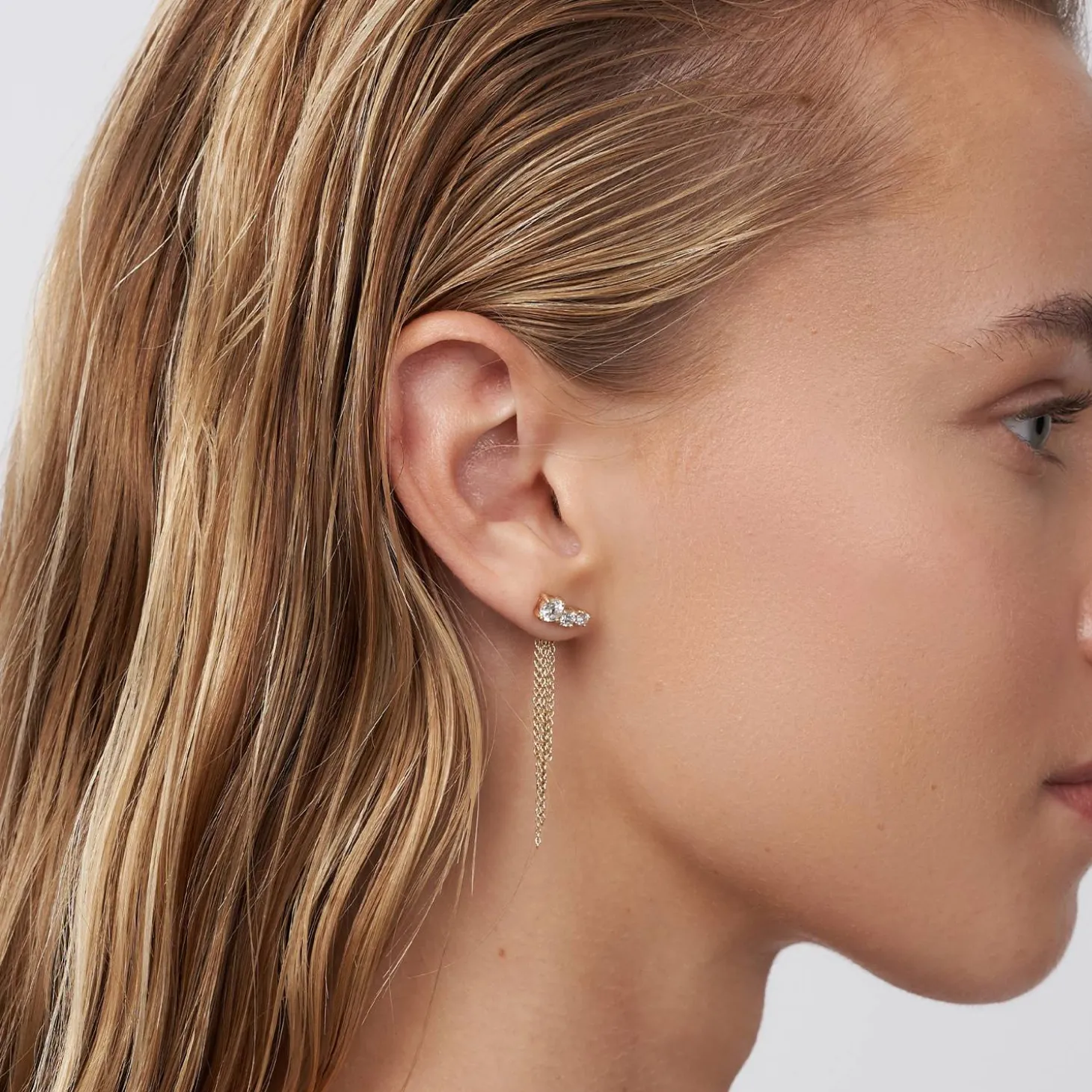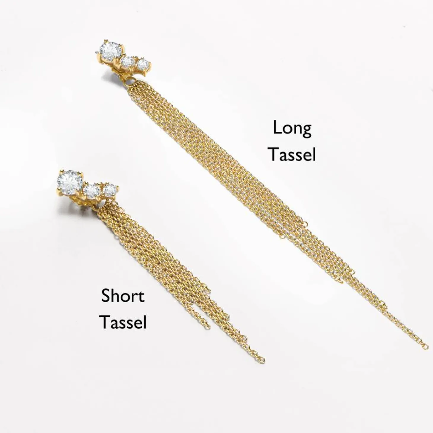 Experience the zenith of luxury with our Mimosa Tassel Stud, featuring a trio of mesmerizing 0.45 CT Diamonds in Gold Vermeil. Classic beauty meets modern allure as its tassel design elegantly complements Oak and Luna studs earrings for endless styling options. Choose singular or paired perfection – each set presents a tassel and matching stud, impeccably secured. Elevate your elegance with enduring opulence and a radiant sophistication that sets you apart.