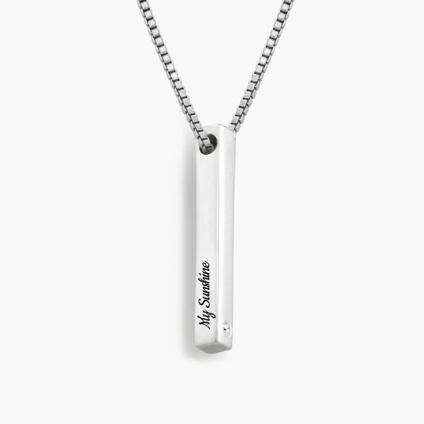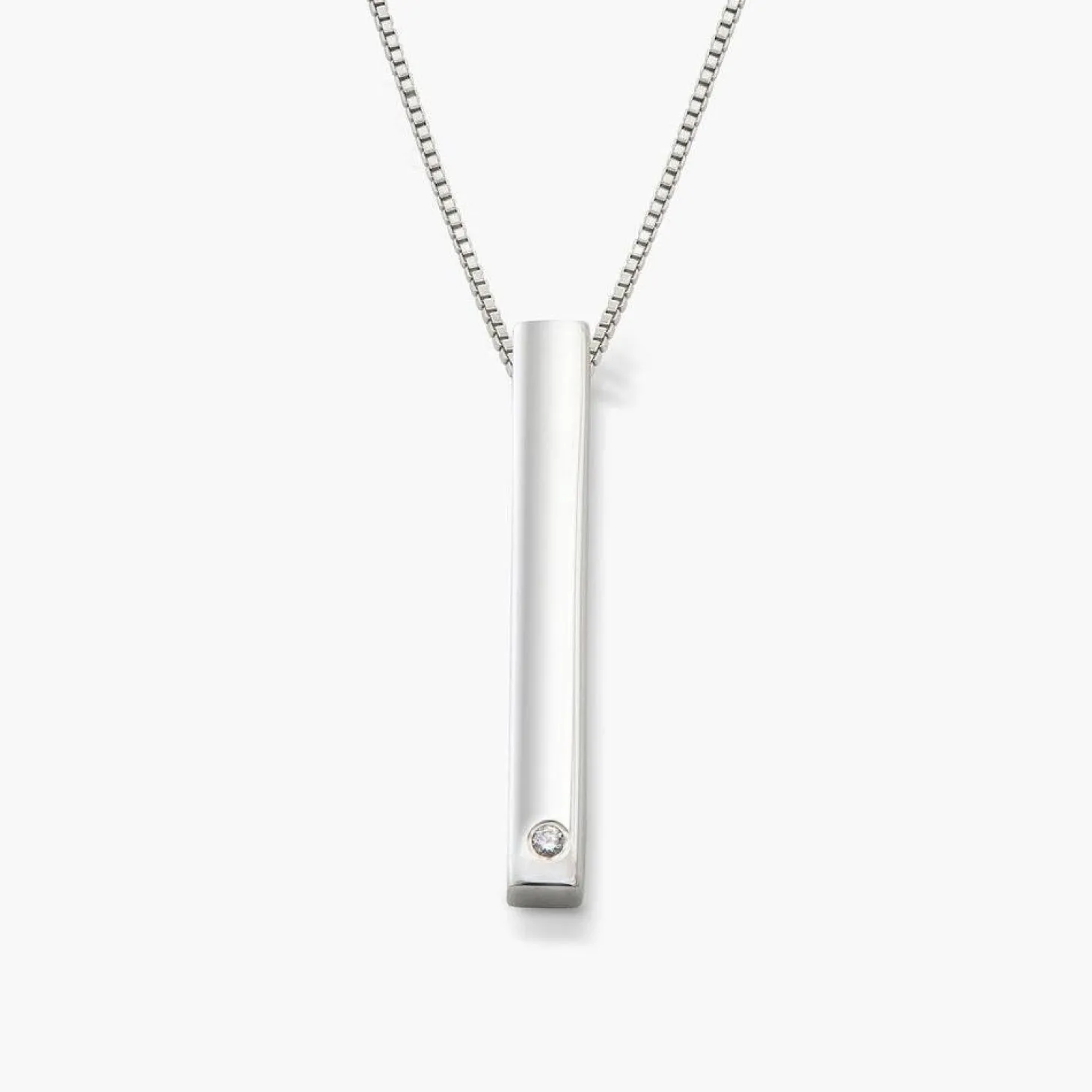 Step up your everyday look! This sterling silver bar necklace offers a little something extra: A sparkling diamond lends a luxe touch to a versatile favorite. Lovely on its own or layered with longer and shorter pieces, this vertical diamond bar necklace is an effortless accent you’ll find yourself wearing again and again. The sterling silver pendant hangs from a beautiful closed rollo chain for a perfectly feminine look.