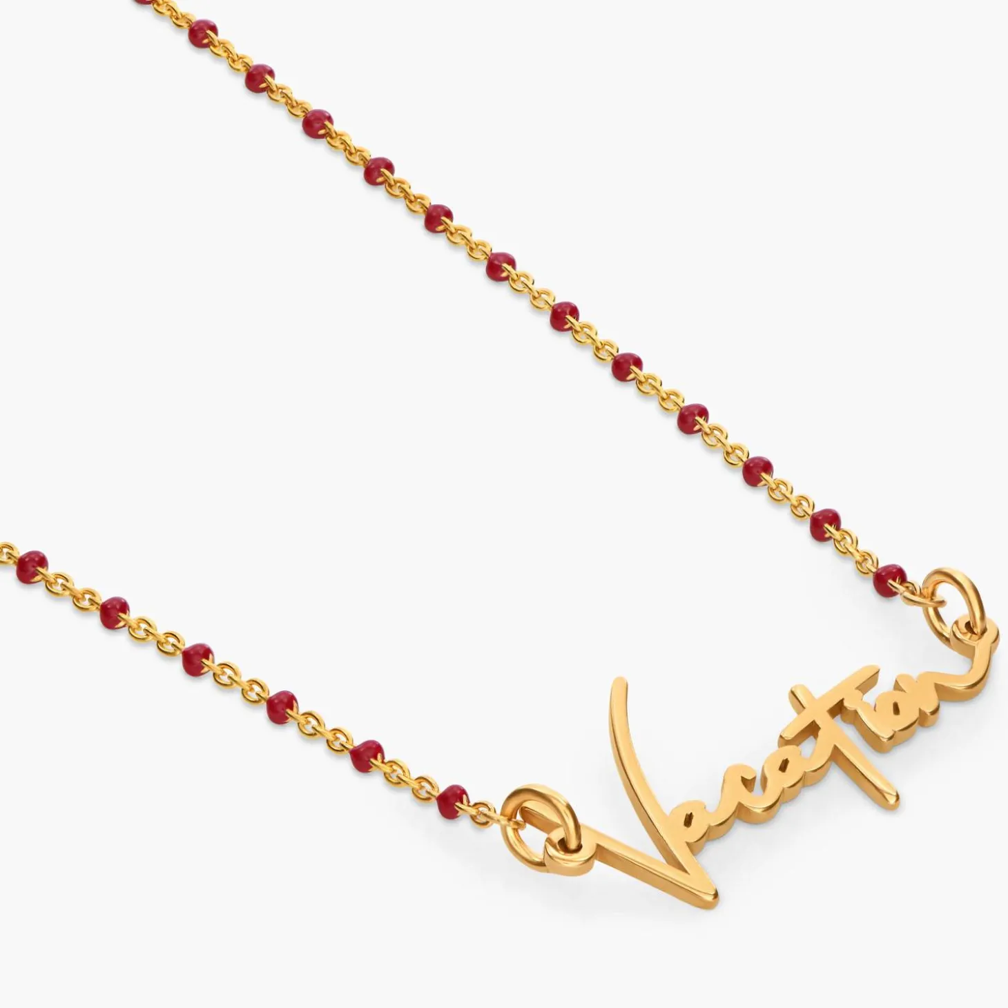 The Soltale Bordeaux Belle Name Necklace in gold vermeil offers a rich, luxurious vibe with its deep bordeaux enamel charm. Personalize it with up to 3 names, and enjoy the warmth and elegance of the gold vermeil cable chain. This piece is perfect for adding sophistication and color to your summer wardrobe.