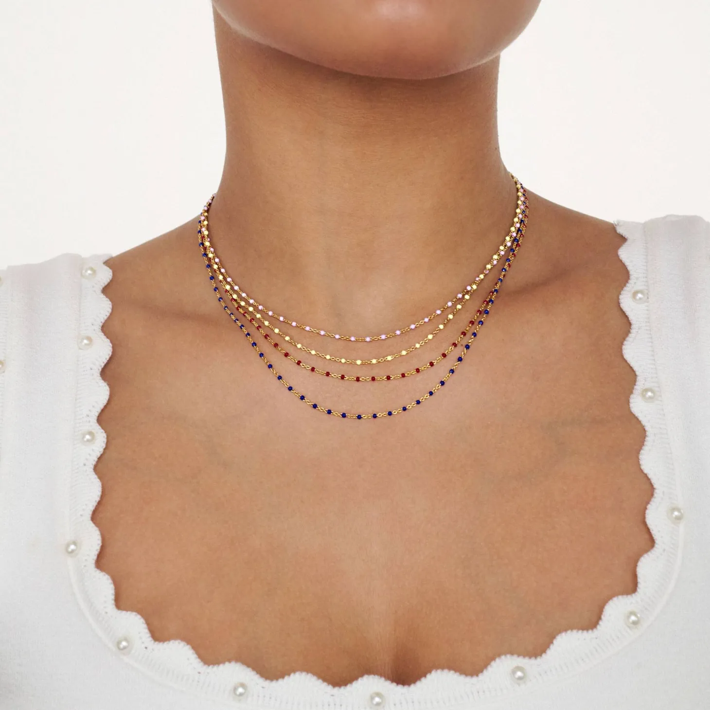 The Soltale Bordeaux Enamel Chain in gold vermeil adds a touch of luxury with its deep bordeaux enamel charm. The gold vermeil cable chain provides a warm and sophisticated finish, perfect for layering or wearing solo to elevate your summer style.