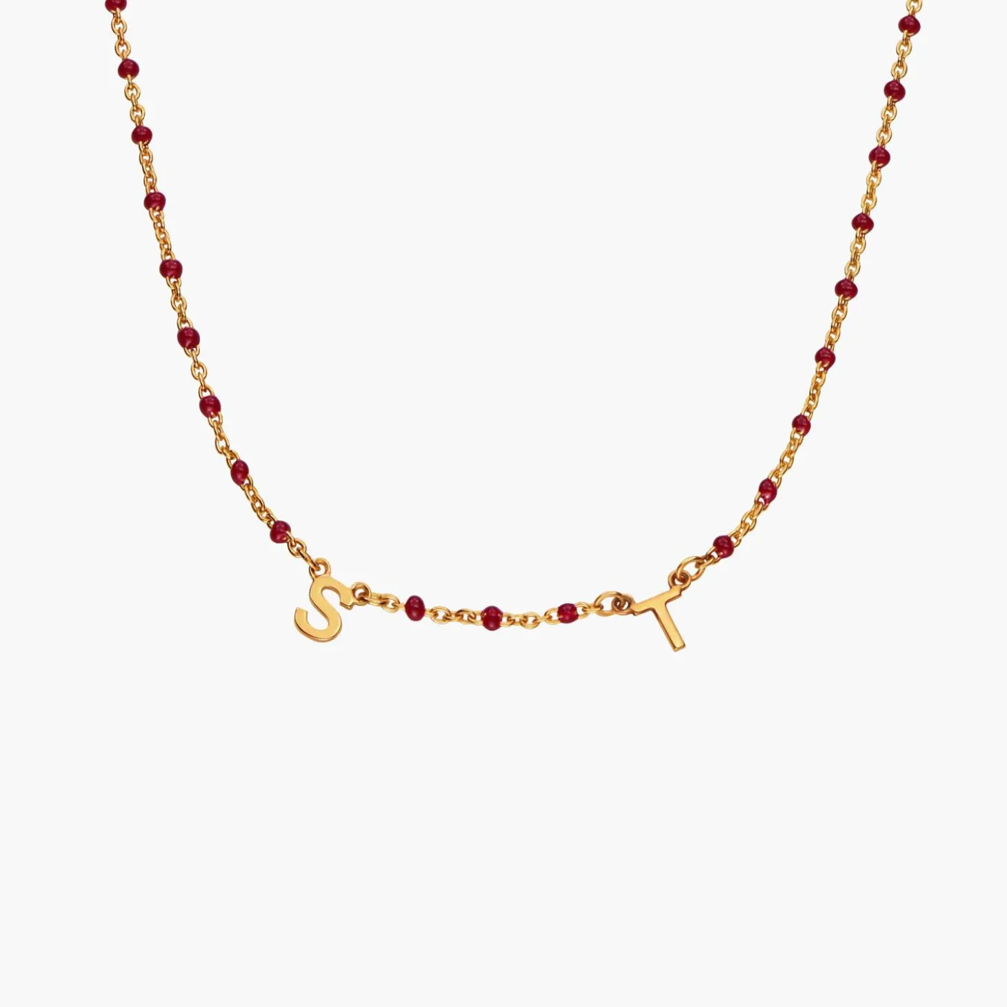 The Soltale Bordeaux Inez Initial Necklace in gold vermeil offers a rich, deep bordeaux enamel charm with customizable initials. The warm gold vermeil finish gives it a sophisticated touch, perfect for a meaningful, elegant accessory to wear all season long.