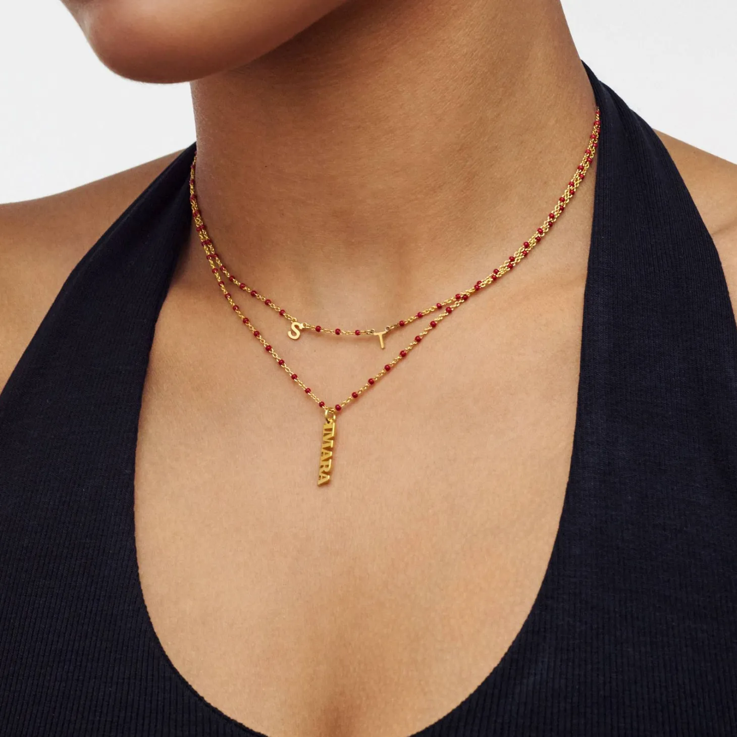 The Soltale Bordeaux Singapore Chain Name Necklace in gold vermeil is the epitome of luxury and style. The rich bordeaux enamel charm, customizable with 1-3 names, is paired with a gold vermeil cable chain for a refined and elegant look. This necklace is perfect for adding depth and sophistication to your summer style.