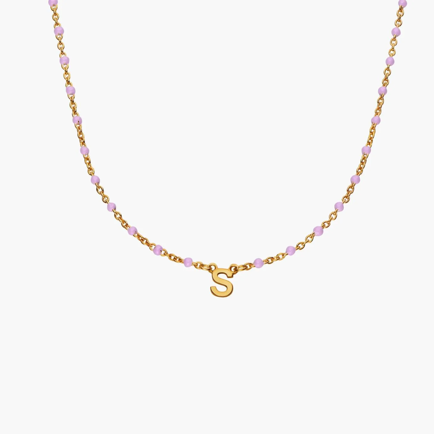 The Soltale Lavender Inez Initial Necklace in gold vermeil offers a calming lavender enamel charm with customizable initials. With 1-4 initials and a gold vermeil chain, this necklace adds a warm, soft glow to your personalized summer style.