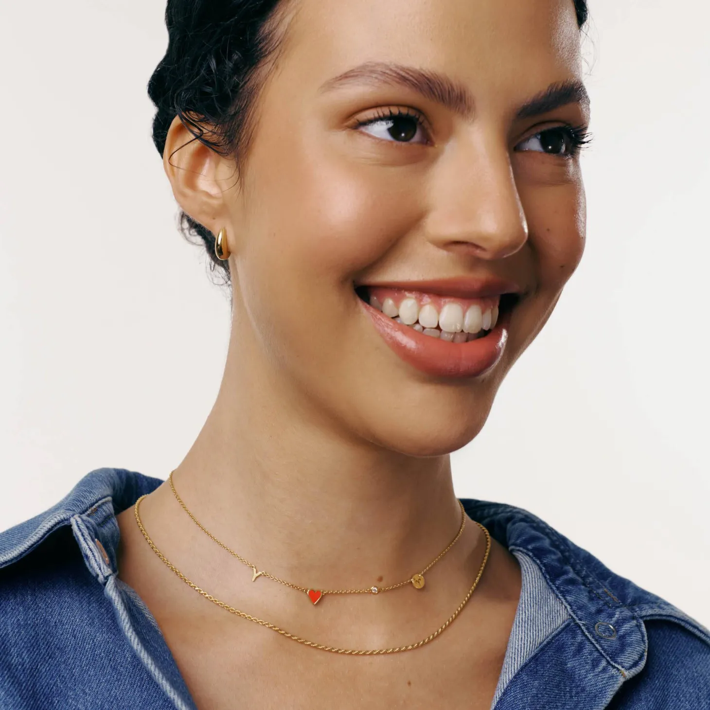 The Inez Necklace features your Zodiac sign and initial, accented with a radiant 0.3 ct diamond and a charming red heart. Paired with a versatile Rope Chain and chic Small Dome Earrings, this set adds a unique twist to classic sophistication, celebrating individuality with style.