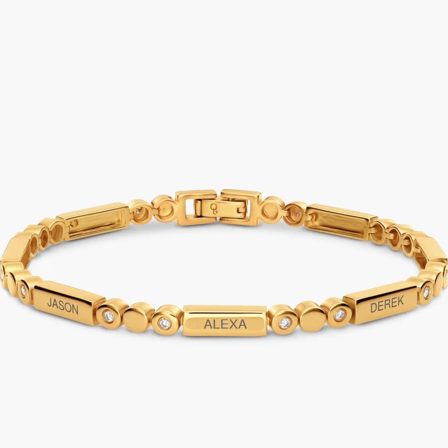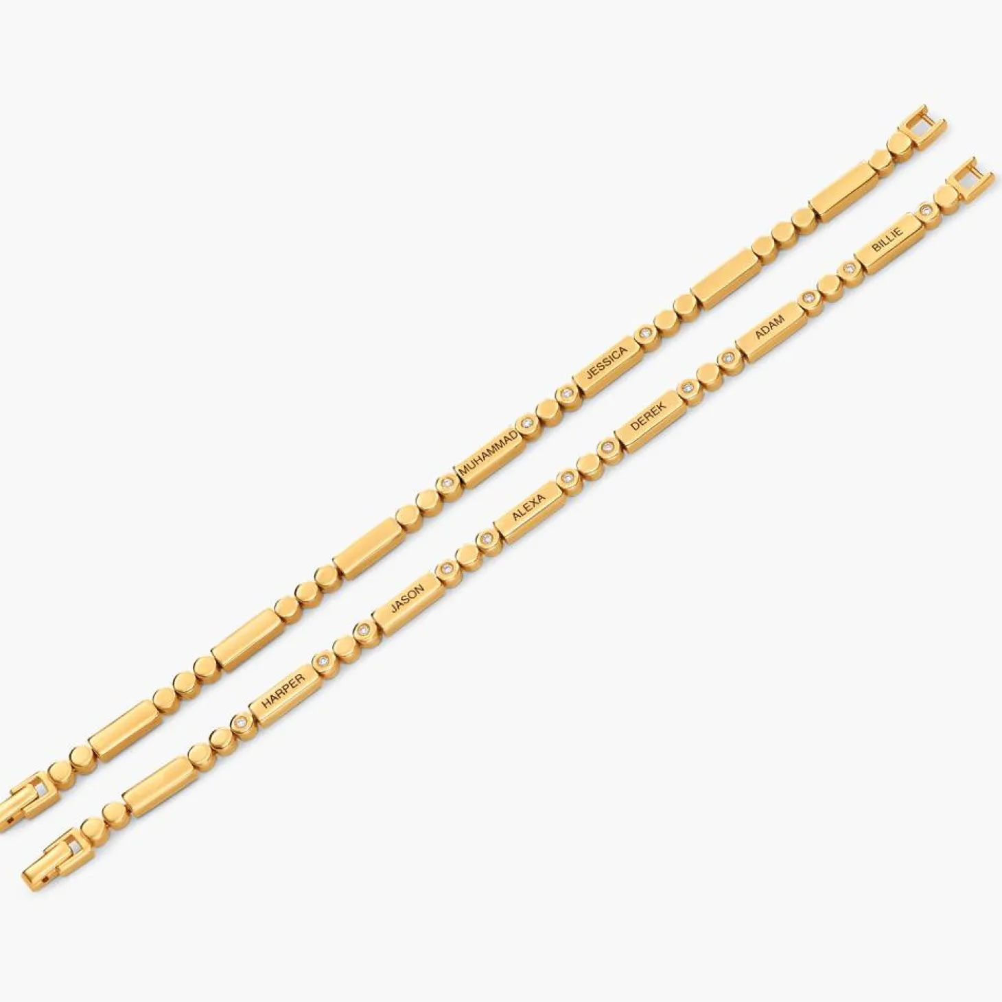 A luxurious gold vermeil bracelet adorned with a diamond-studded rectangular charm and a heart detail. Personalize it with up to 6 names, each up to 8 characters. Perfect for stacking, mixing, and layering with other metals.