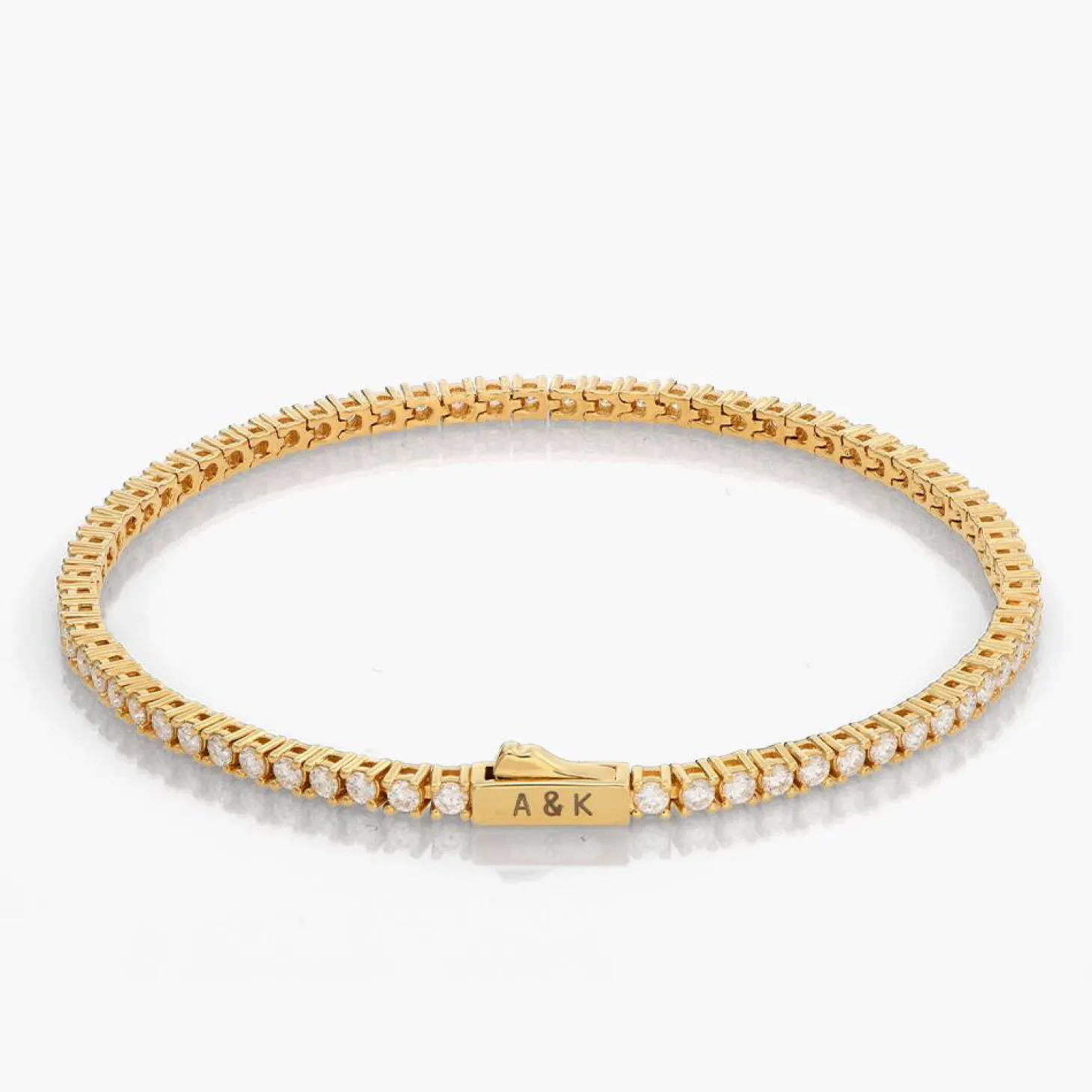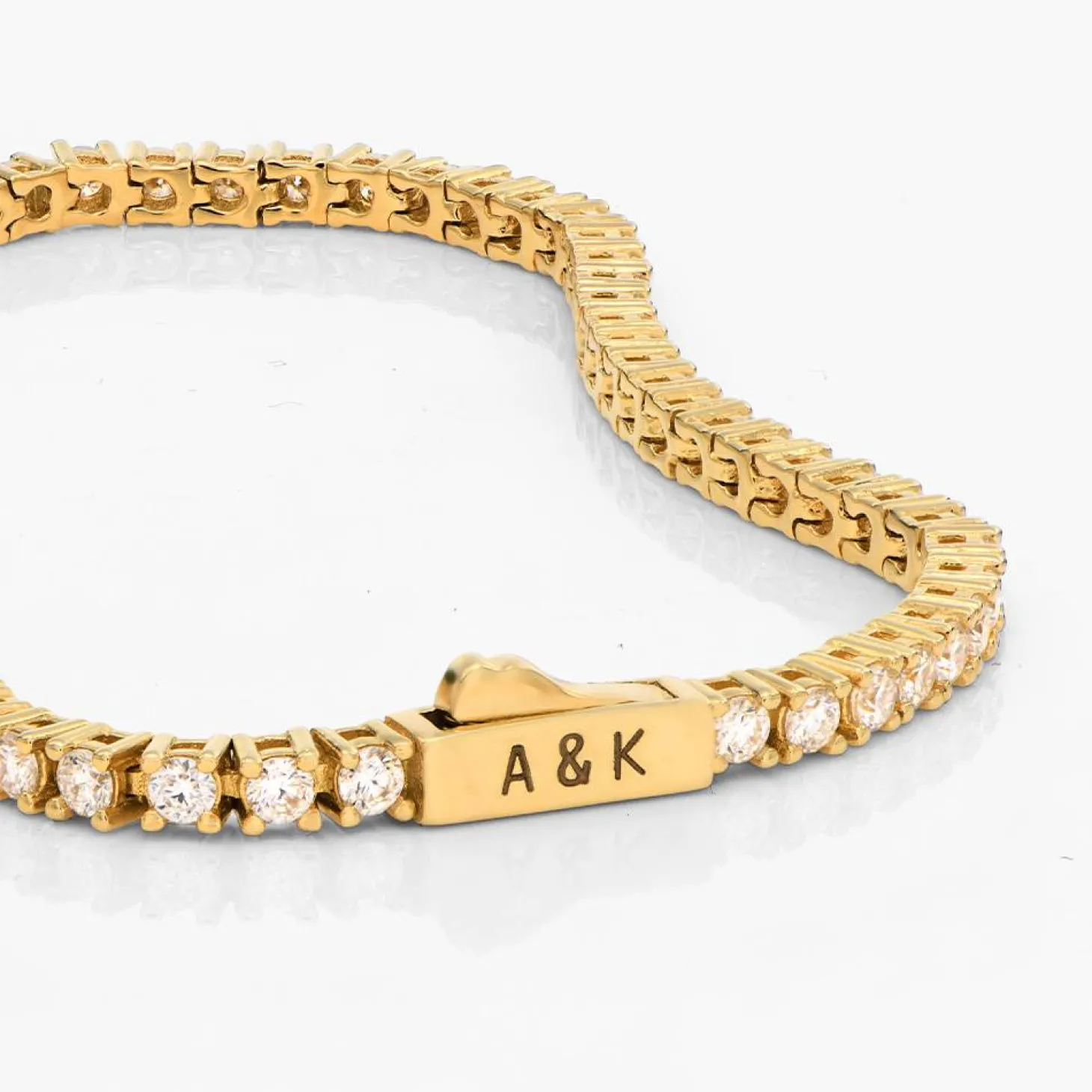 Introducing our Engraved Moissanite Tennis Bracelet in luxurious Gold Vermeil—a harmonious union of opulence and timeless beauty. Each Moissanite stone, celebrated for its brilliance and durability, is meticulously set, creating a classic and refined piece. Elevate the elegance with a personal touch through custom engraving, transforming it into a cherished keepsake. Experience unparalleled sophistication with this exquisite bracelet. Featuring push clasp closure with safety latch.