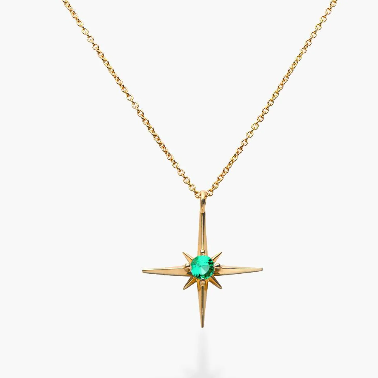 The Northern Star design, combined with the allure of the green emerald, captures celestial elegance and individuality. Embrace the enchantment with this finely crafted necklace, a perfect synthesis of sophistication and sentiment in luxurious gold.