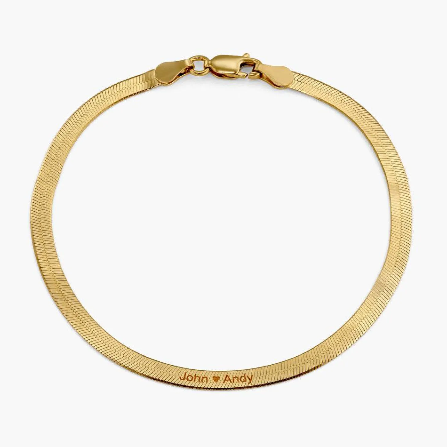 The Herringbone Engraved Slim Bracelet in Gold Plating is a sophisticated bracelet with a unique, personalized touch. This chic and delicate wrist piece features an engraved phrase on a slim herringbone gold-plated snake band. Just imagine how great you’ll feel sliding this gorgeous little treasure on your wrist for everyday wear or as a special occasion accessory.