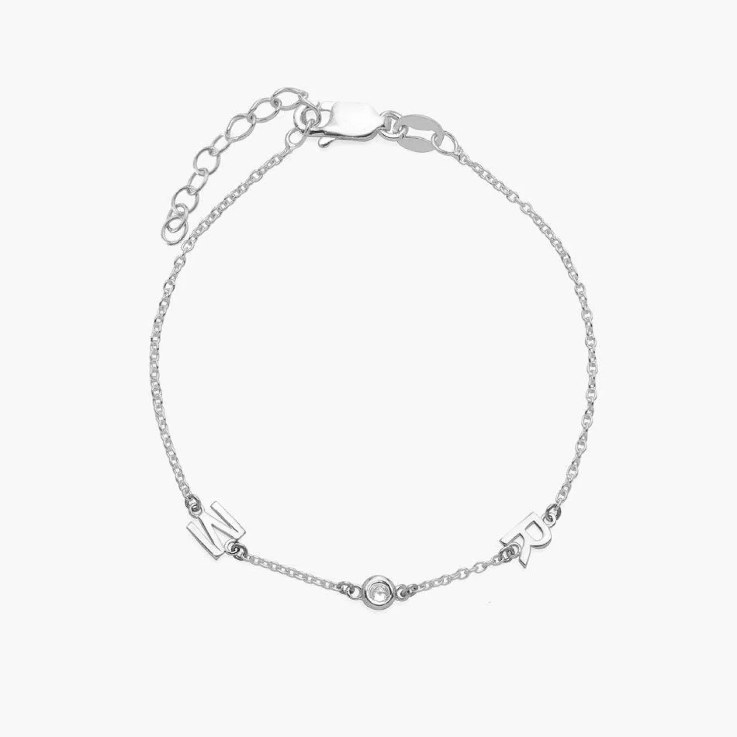 Customize Me! You can customize this silver initial bracelet with one to three letters and one to two diamonds. The spaced-out initials come in all caps and are attached on a cable chain.