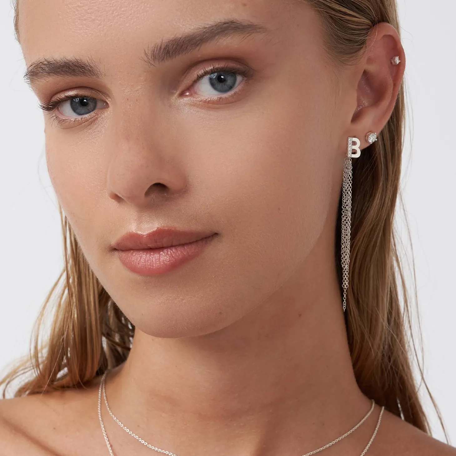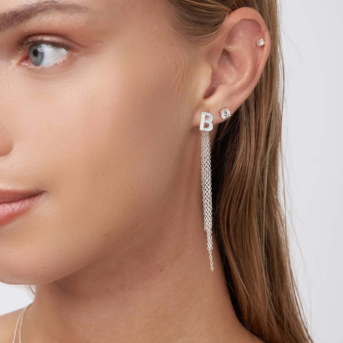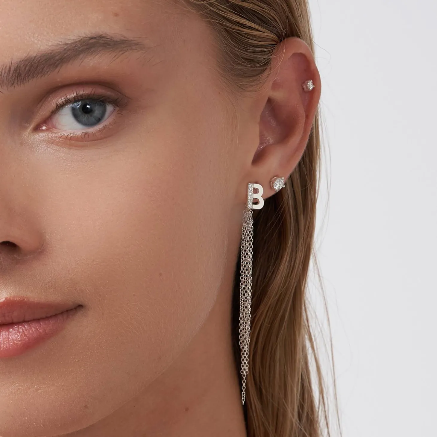 Elevate your elegance with our Long Tassel adorned with Diamond Initials in Silver. These shimmering diamonds add a touch of sophistication to your chosen initials, featured on an initial stud, a versatile closer, and a graceful tassel. Whether you opt for a single earring or a pair, this accessory effortlessly infuses personalized charm into any ensemble. Mix and match with Oak and Luna studs to create a versatile, personalized look.