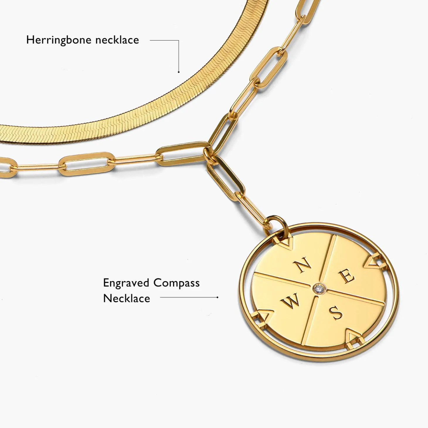 Elevate your style with our “Make a Statement“ Set featuring two exquisite necklaces. The sleek Herringbone Necklace adds sophistication, while the personalized Compass Necklace, engraved with up to four initials, adds a touch of individuality. Crafted with precision, this set promises to make a lasting impression.