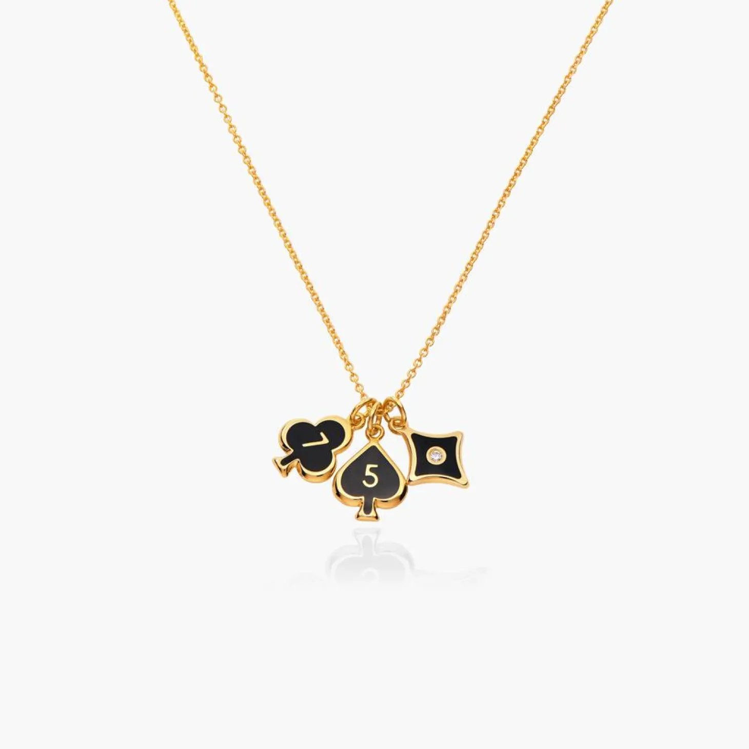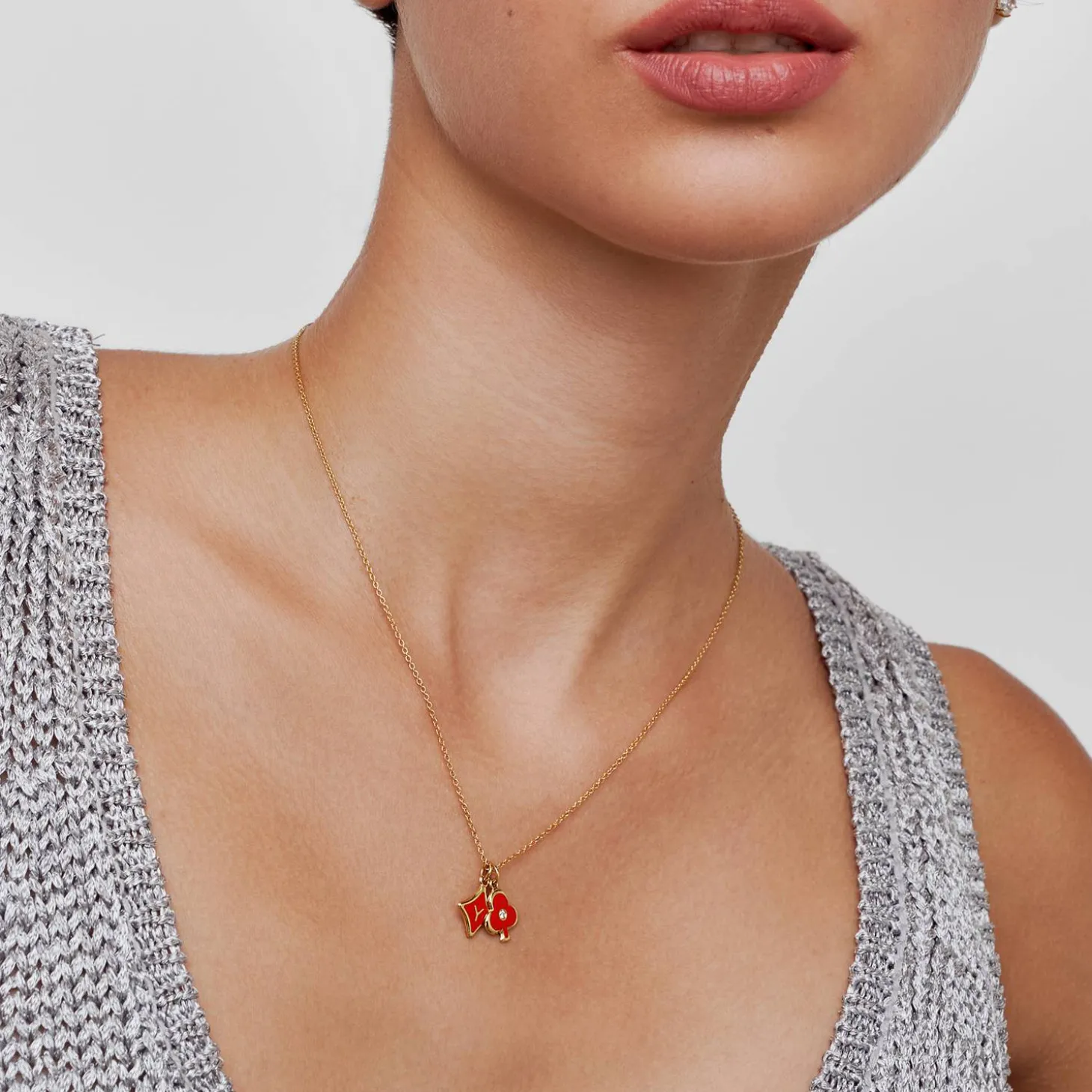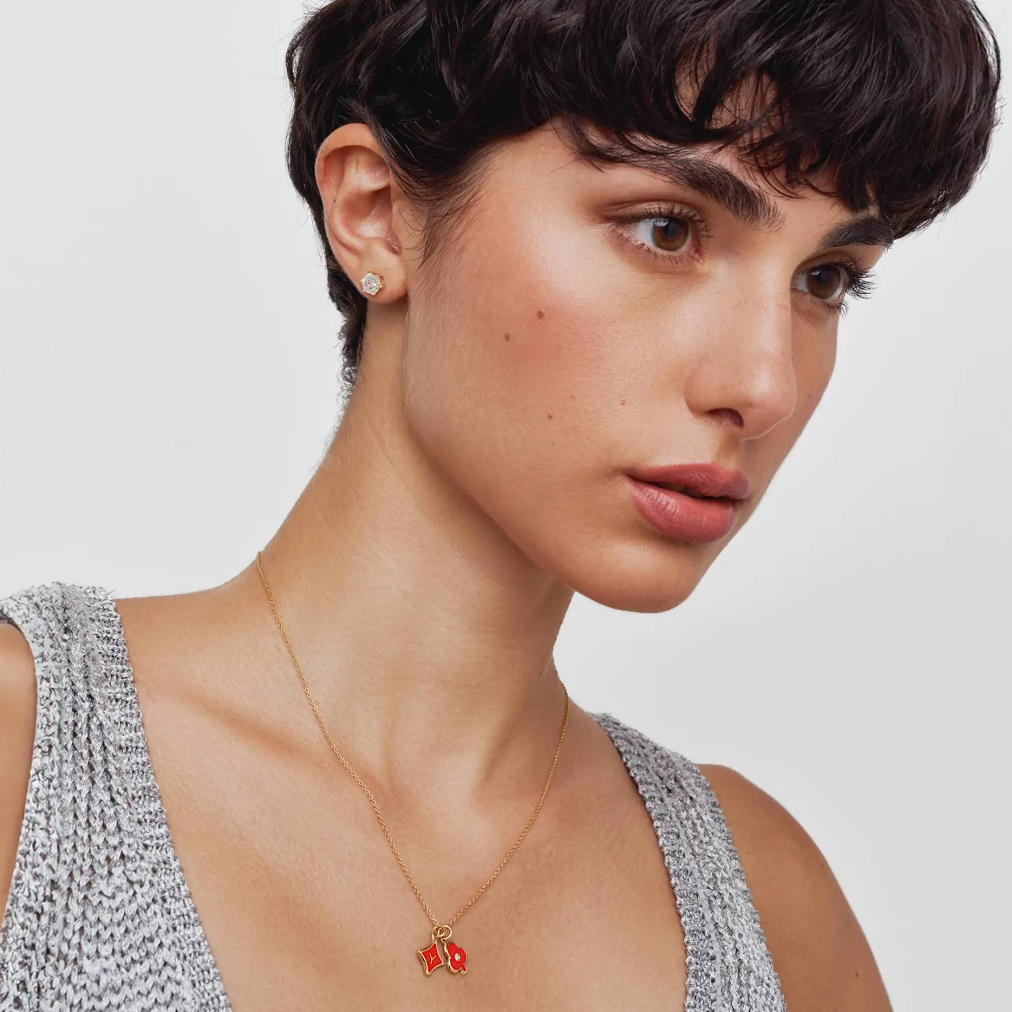 Experience luxury with the Midnight Enamel Willow Card Initials Necklace in Gold Vermeil with Diamonds. Select a red or black enamel pendant featuring card symbols—clubs for prosperity, diamonds for strength, hearts for inner peace, and spades for warrior spirit. Adorned with dazzling diamonds, personalize with up to four initials for a unique and elegant statement piece.