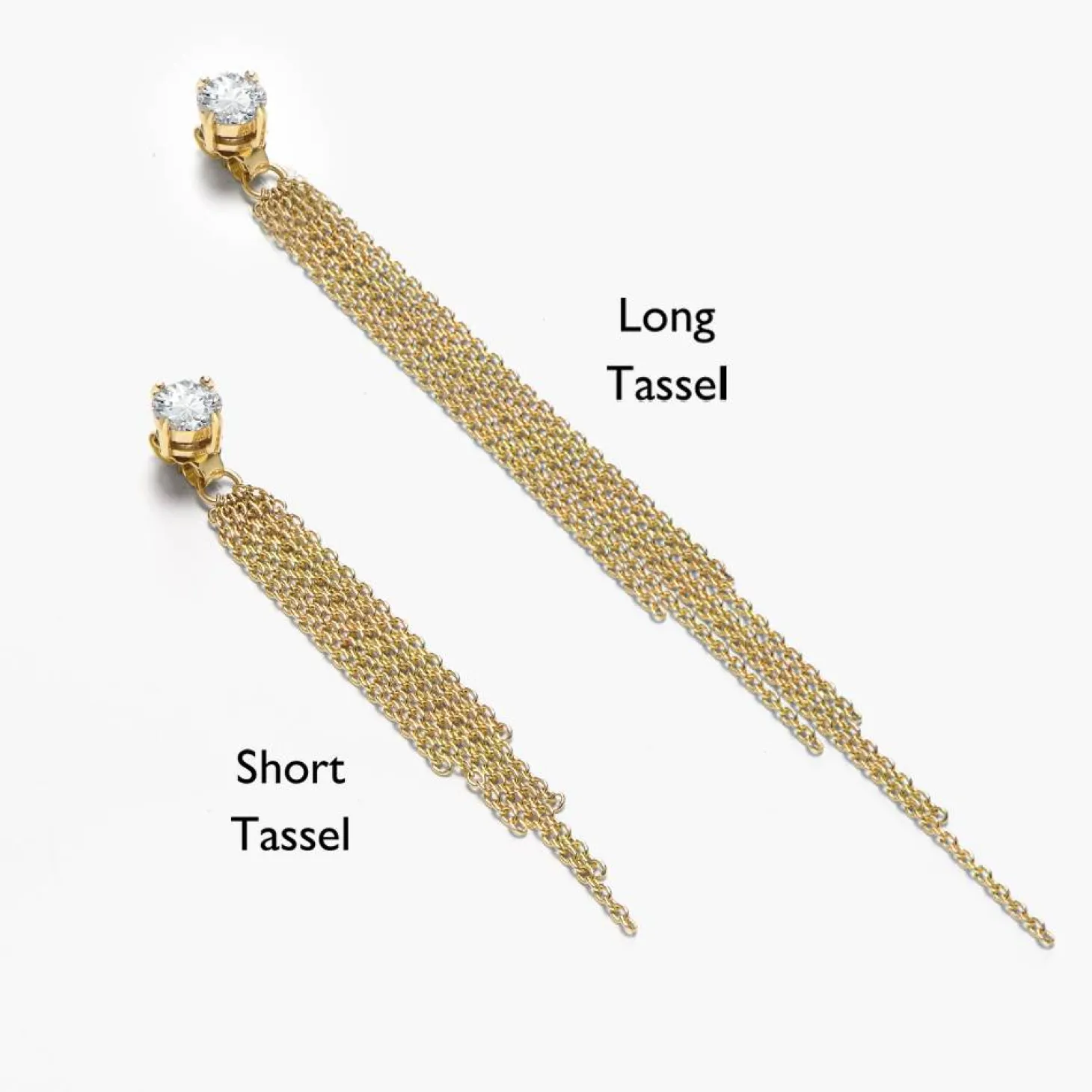 A symphony of timeless charm and contemporary chic, its elongated tassel design exudes refined luxury. Elevate your style effortlessly, harmonizing with Oak and Luna studs for personalized ensembles. Opt for singular or paired perfection – each set features a tassel and matching stud with secure closure. Redefine elegance with a touch of radiant allure that captures attention and admiration.