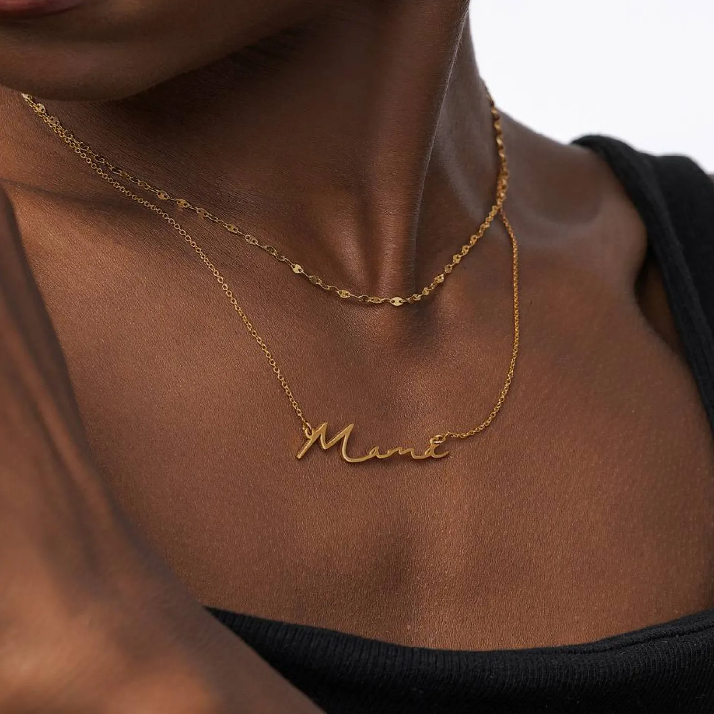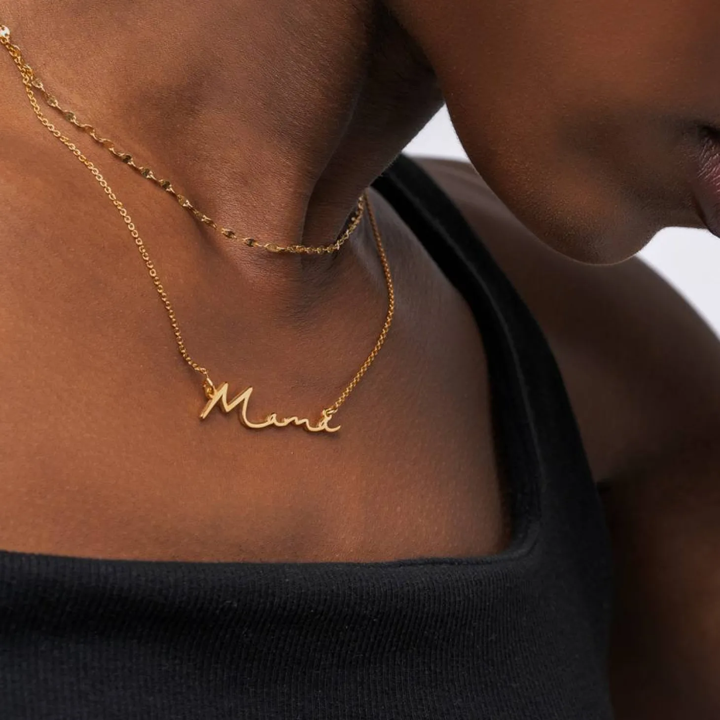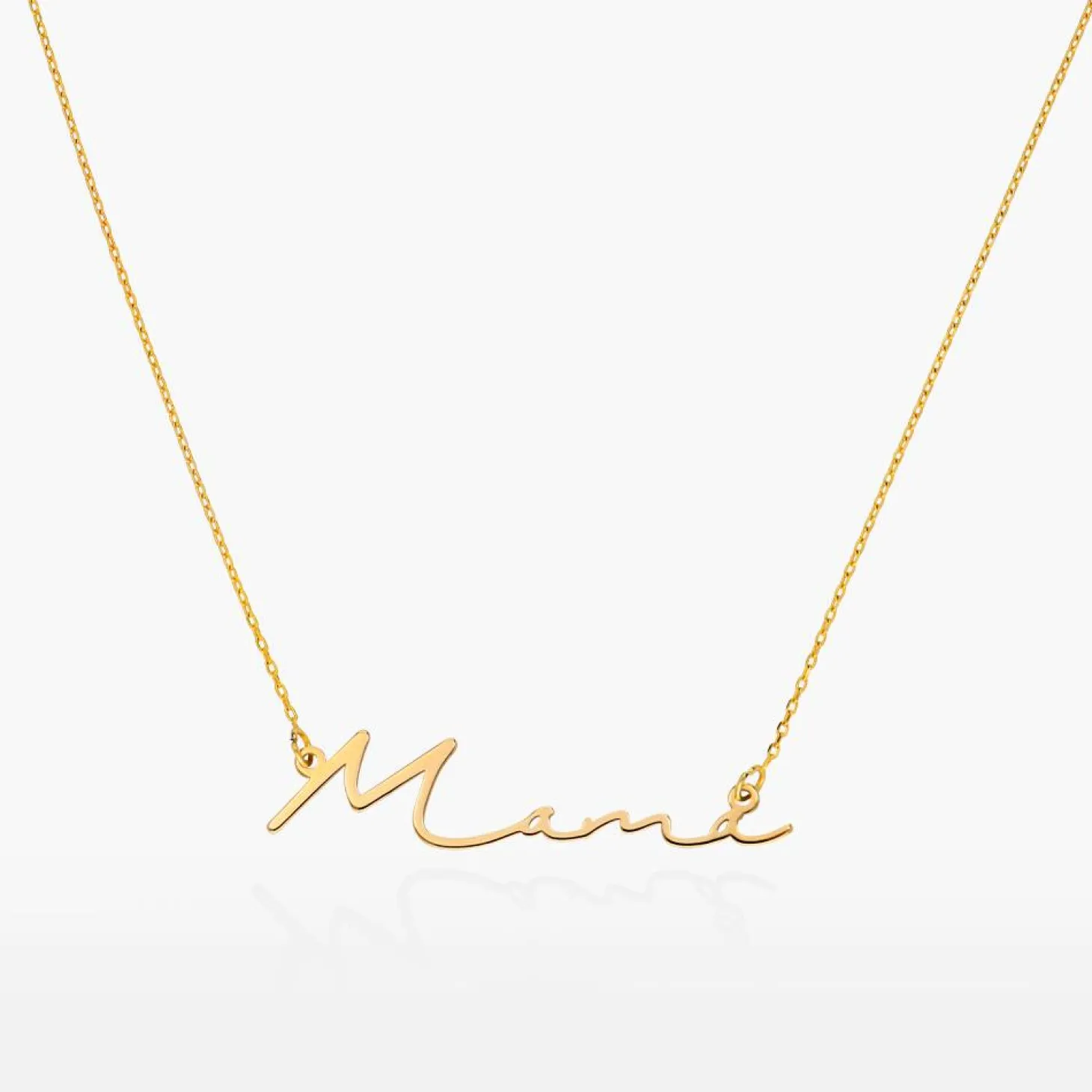 Sleek and simple, our gold-plated Mon Petit Name Necklace creates an effortless signature look that works with all your favorite styles. A cable chain attaches to each side of the pendant with delicate script that is stunning next to your skin. .