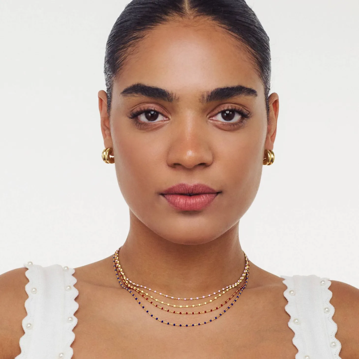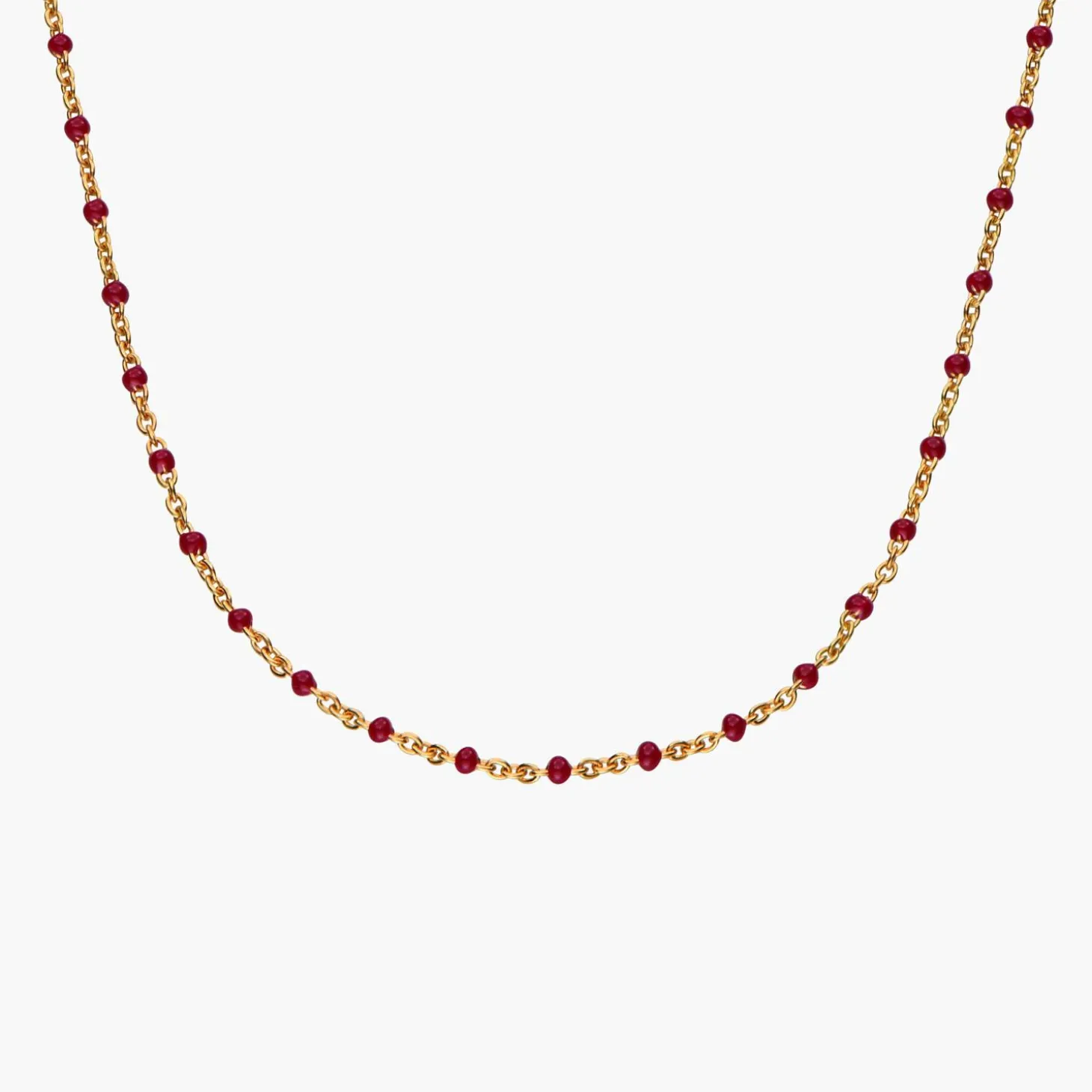 The Soltale Bordeaux Enamel Chain in gold vermeil adds a touch of luxury with its deep bordeaux enamel charm. The gold vermeil cable chain provides a warm and sophisticated finish, perfect for layering or wearing solo to elevate your summer style.