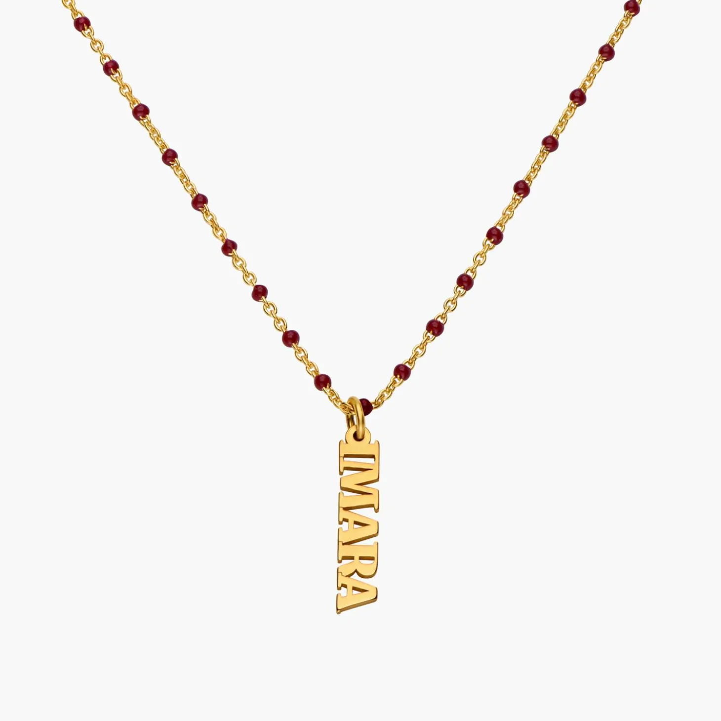 The Soltale Bordeaux Singapore Chain Name Necklace in gold vermeil is the epitome of luxury and style. The rich bordeaux enamel charm, customizable with 1-3 names, is paired with a gold vermeil cable chain for a refined and elegant look. This necklace is perfect for adding depth and sophistication to your summer style.