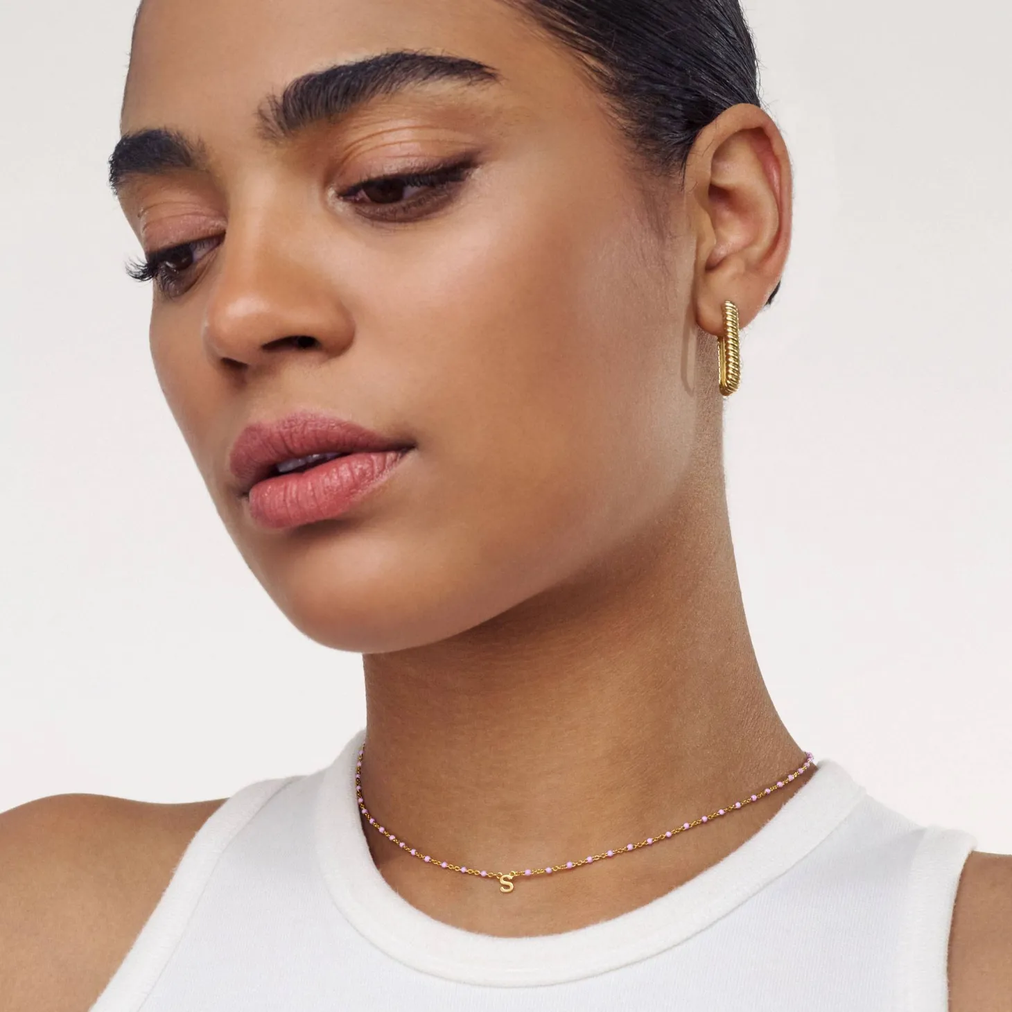 The Soltale Lavender Inez Initial Necklace in gold vermeil offers a calming lavender enamel charm with customizable initials. With 1-4 initials and a gold vermeil chain, this necklace adds a warm, soft glow to your personalized summer style.