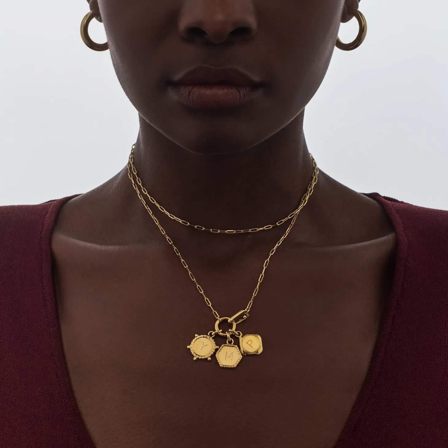 Crafted in luxurious gold vermeil, The Charmer Coins & Initials necklace offer a blend of personalized style and symbolism. With three unique lucky charms and customizable initials, this piece can be adapted and layered with ease, making it uniquely yours. Find more initial necklaces for your collection.