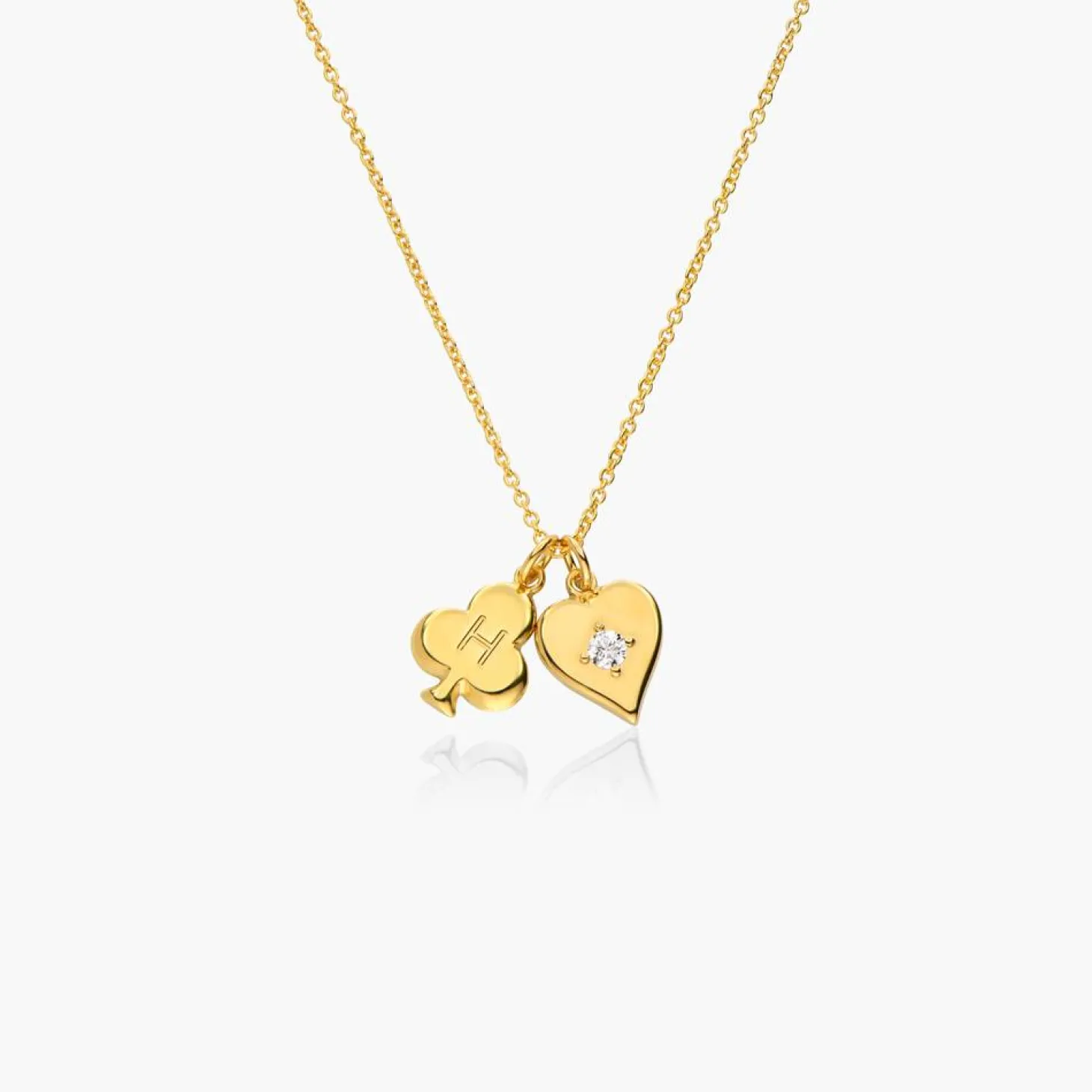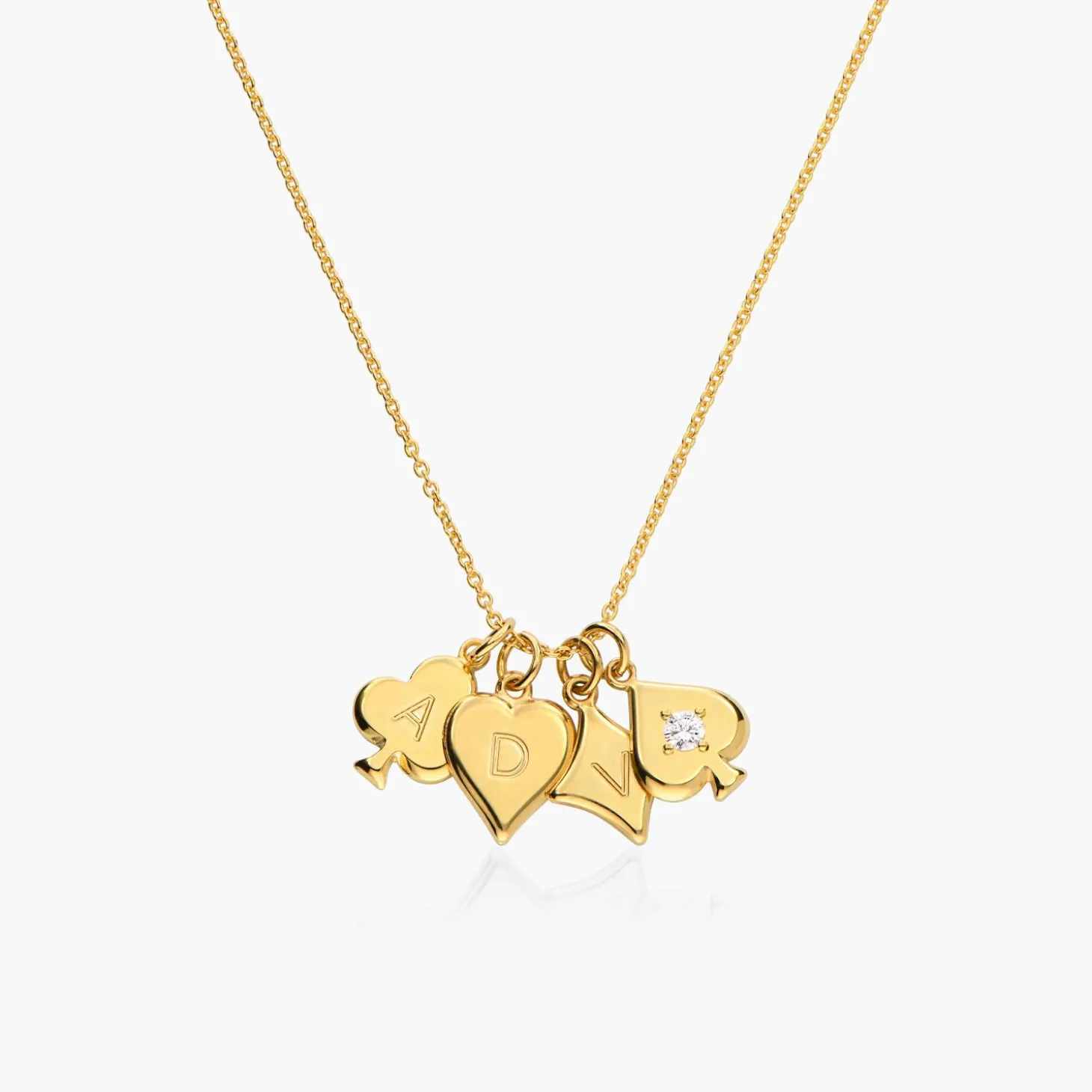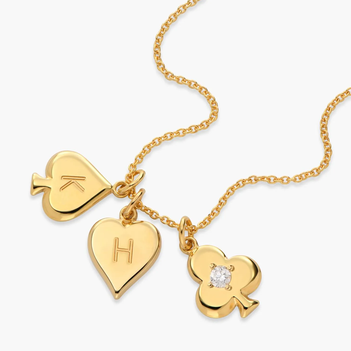 Introducing our exquisite Willow Card Initials Necklace in opulent Gold Vermeil, adorned with a brilliant 0.1 ct diamond. Choose from club, diamond, heart, or spade shapes and engrave up to 4 initials. The diamond accentuates elegance, adding a touch of personalized luxury and timeless sophistication to your ensemble. Add a touch of personality with our women’s necklaces collection.