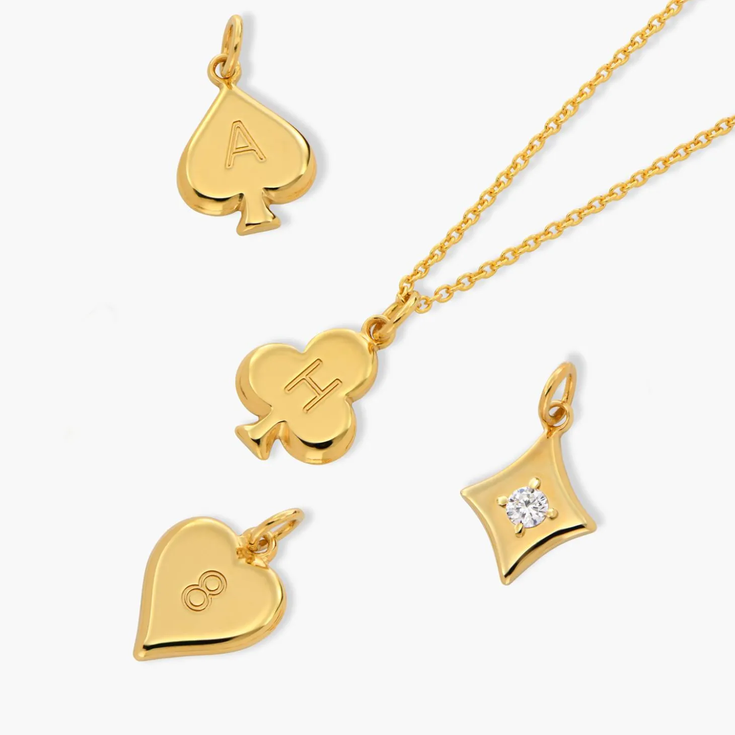 Customize me! Customize each charm with the card-shape you want. One charm is with only Diamond. Customize 1-4 choosen shapes with the initial of your choice.